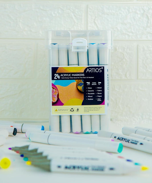 Acrylic Markers Set | 24 Vibrant Colors | Dual Tip Design (1mm Fine + Broad Brush) | Quick-Drying, Non-Toxic, Waterproof| Ideal for Glass, Rock, Wood, Ceramic, Fabric & DIY Crafts
